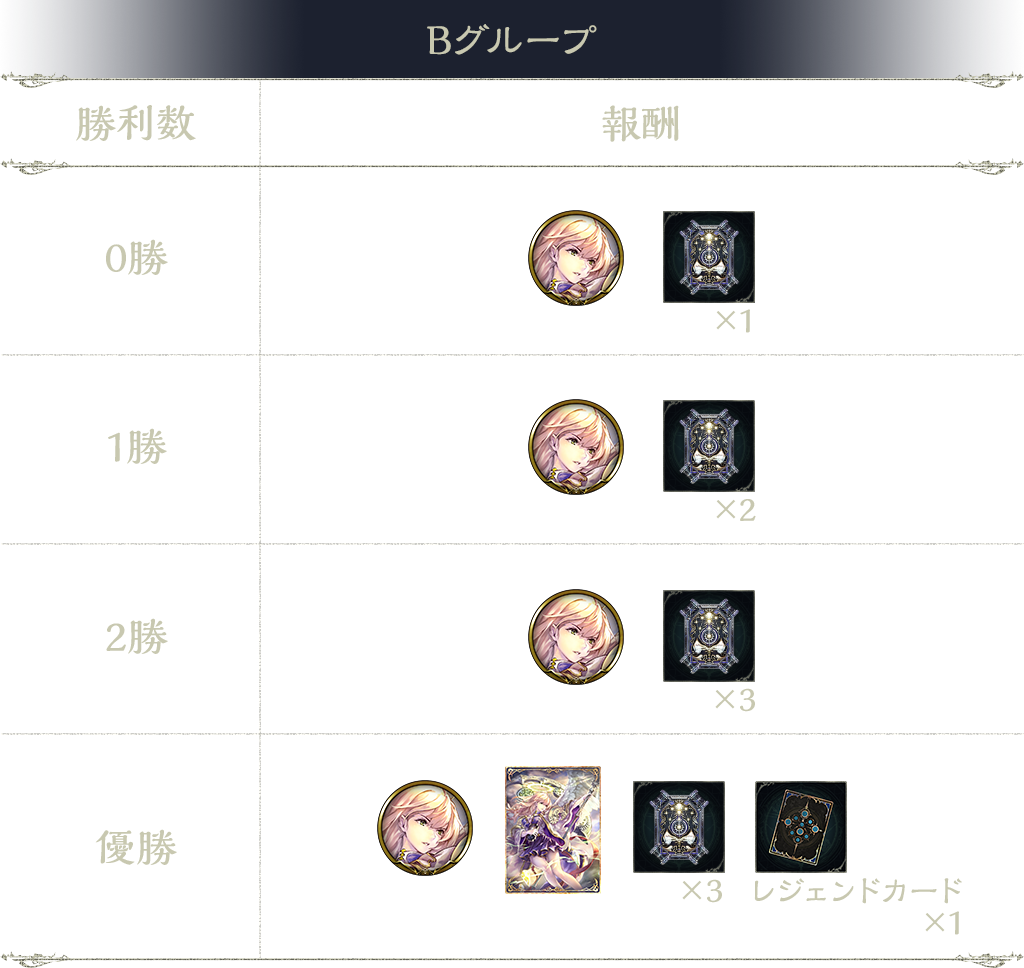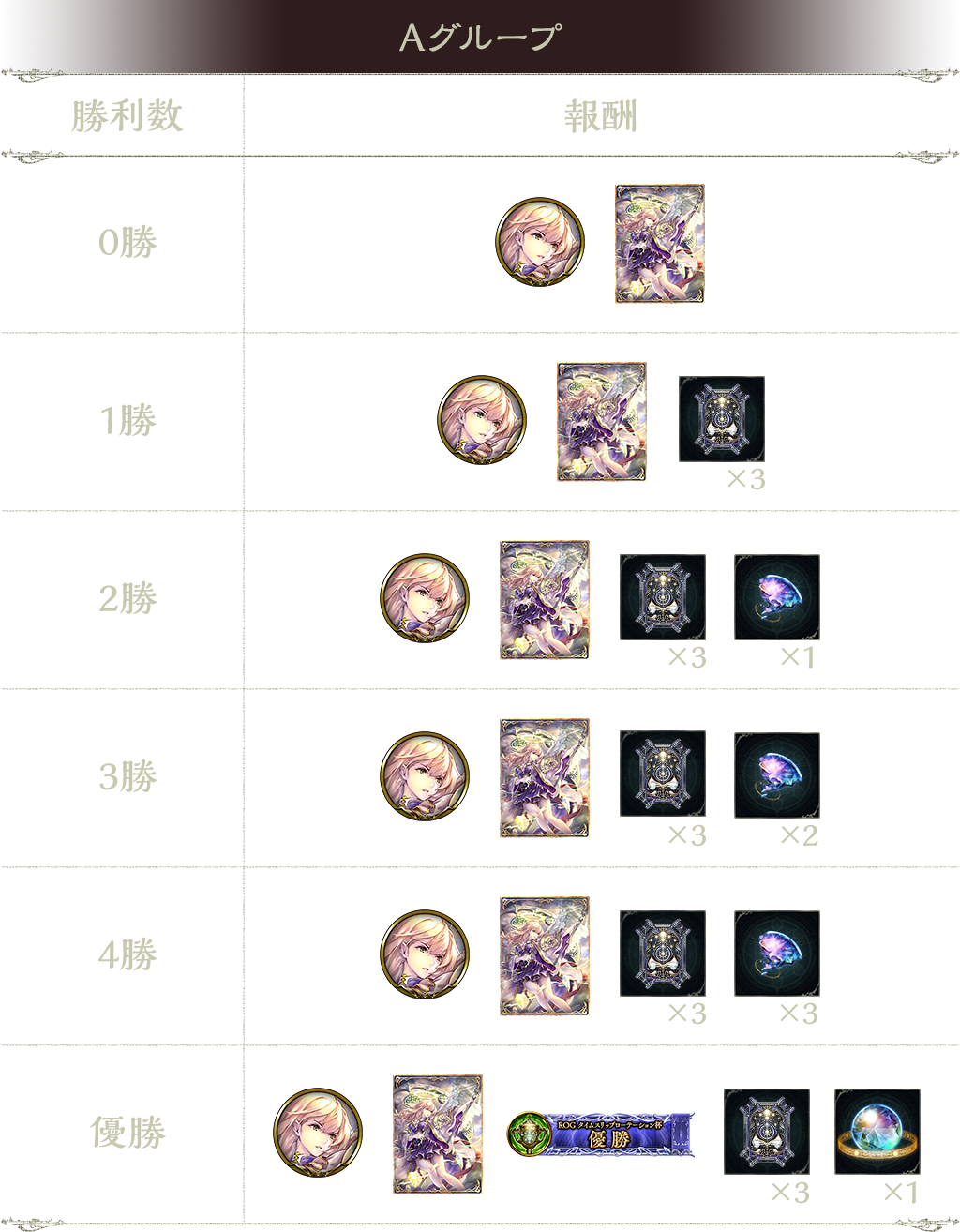 3勝:タイムスリップローテーションカードパックチケット 3枚、オーブの欠片 2個