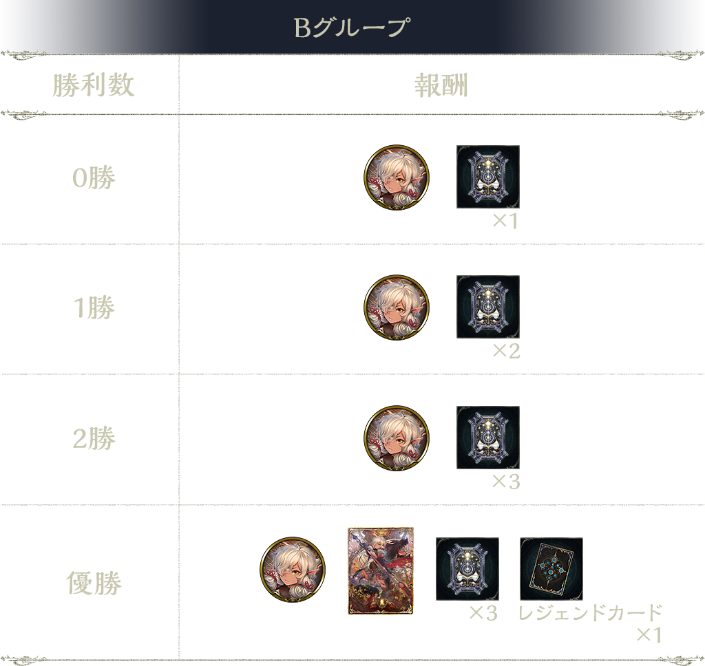 3勝:タイムスリップローテーションカードパックチケット 3枚、レジェンドカード 1枚(ランダム)、閃光のエルフ・アルバータ(進化後)(スリーブ)