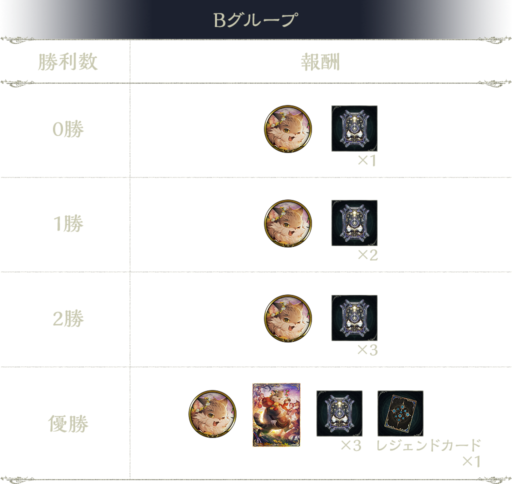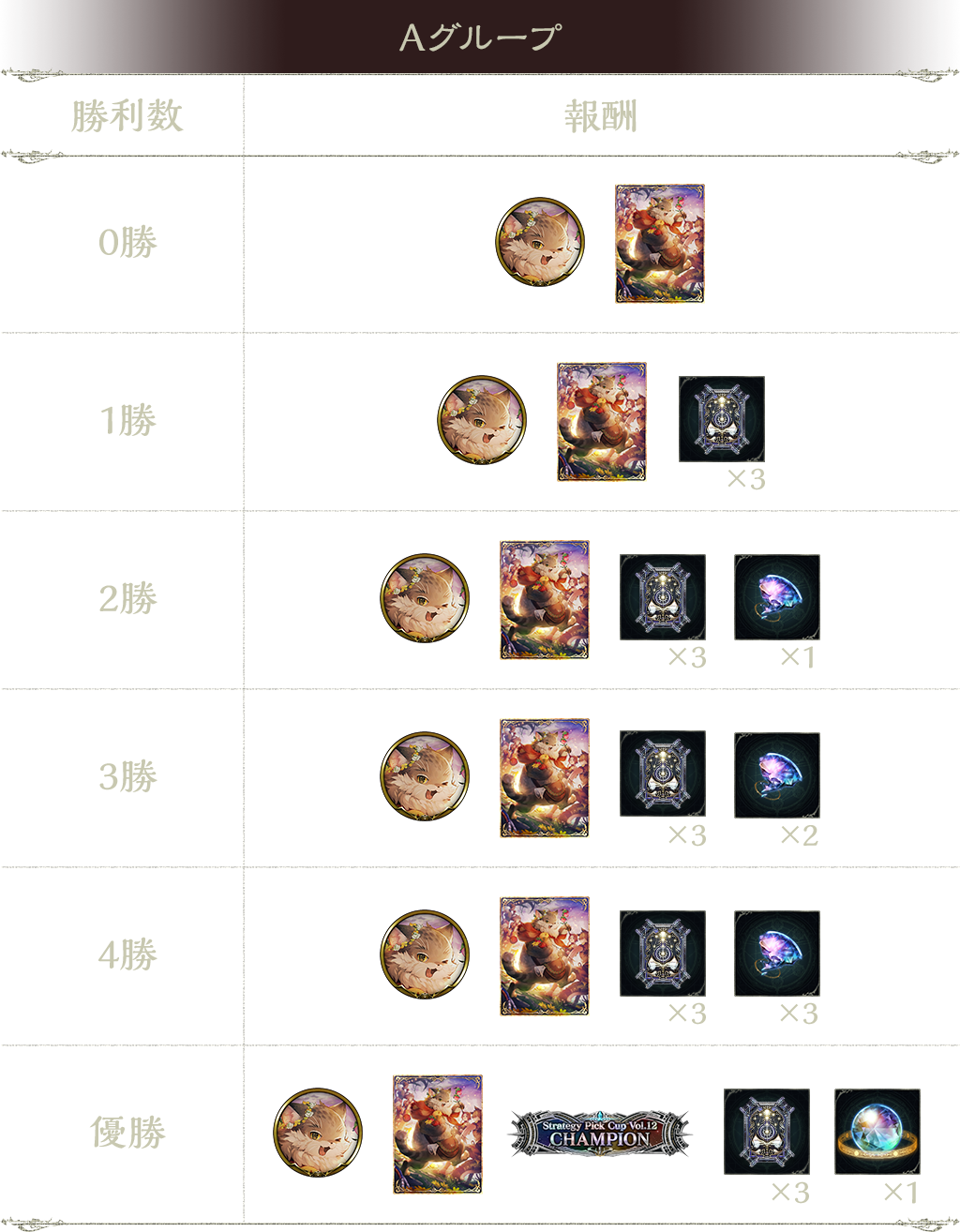 5勝:タイムスリップローテーションカードパックチケット 3枚、プレミアムオーブ 1個、Strategy Pick Cup Vol.12 CHAMPION(称号)