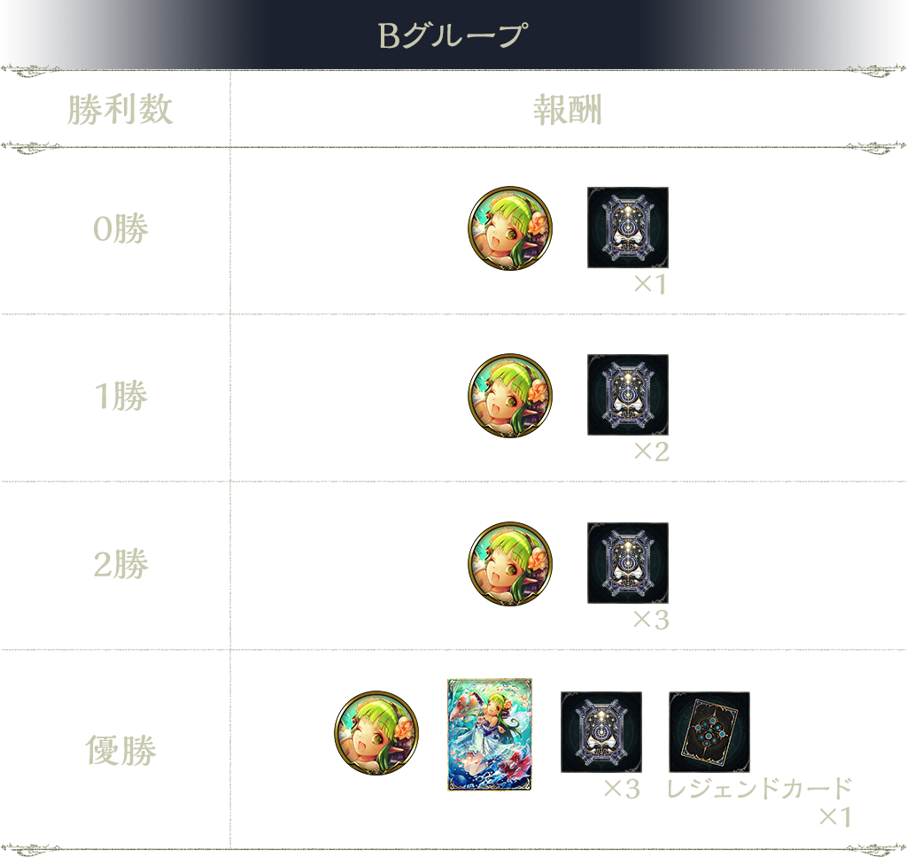 3勝:タイムスリップローテーションカードパックチケット 3枚、レジェンドカード 1枚(ランダム)、楽園妖精・アイリス(進化後)(スリーブ)