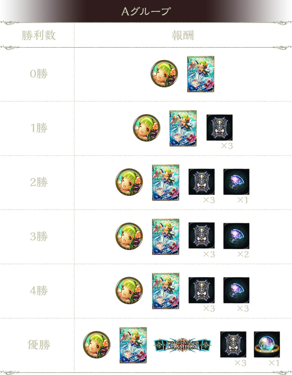 5勝:タイムスリップローテーションカードパックチケット 3枚、プレミアムオーブ 1個、オールスター2Pick Cup Vol.4 CHAMPION(称号)