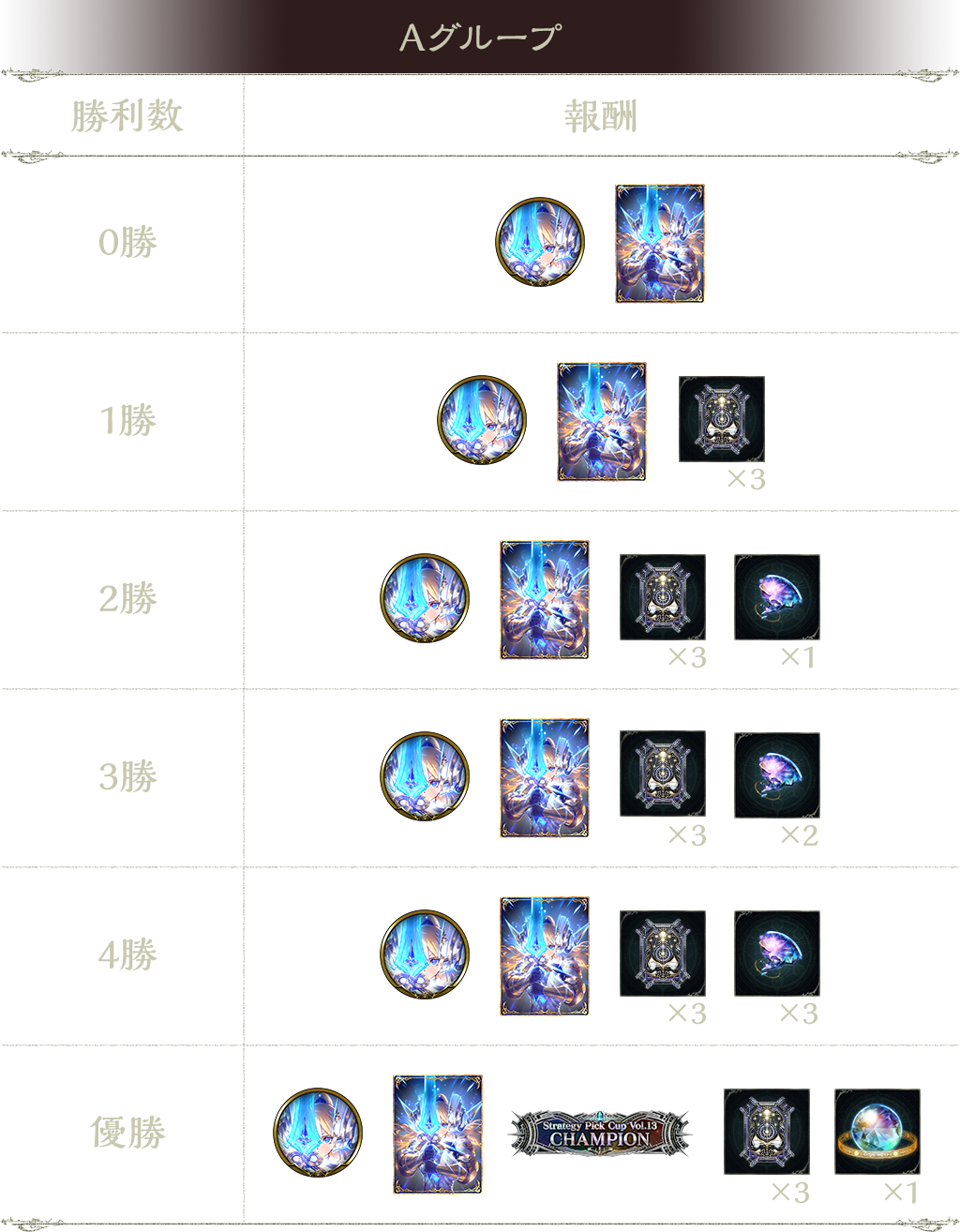 5勝:タイムスリップローテーションカードパックチケット 3枚、プレミアムオーブ 1個、Strategy Pick Cup Vol.13 CHAMPION(称号)