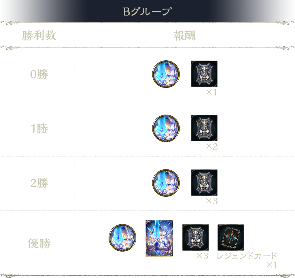 3勝:タイムスリップローテーションカードパックチケット 3枚、レジェンドカード 1枚(ランダム)、聖女の号令(スリーブ)